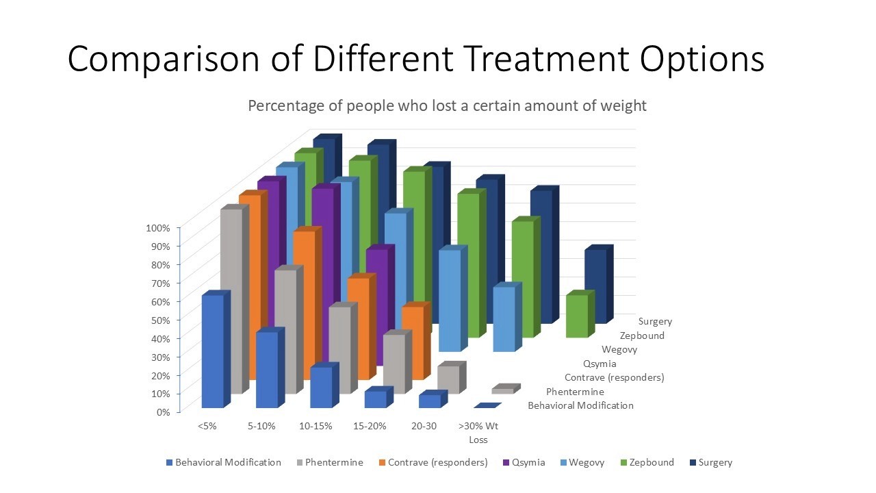Each medication has unique properties that determine how effective it is. This graph shows a visual representation of the percentage of people that can reach a certain percentage of body weight loss. The average numbers referred to below refer to when 50% of people can reach a certain weight loss goal.